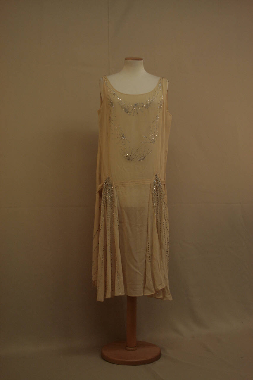 abito lungo al polpaccio, senza maniche, a vita bassa con doppia gonna, in crespo color crema decorato da strass incastonati attraverso il tessuto. Ampio scollo rotondo decorato da strass che formano ventagli di linee. Spallini arricciati, vita bassa segnata da nervature. Sotto le nervature è inserito il pannello in sbieco che forma la gonna esterna, aperta sul davanti dove forma due punte verso l'alto sui fianchi. Qui sono inseriti anche due cinturini da annodare sul dietro. La gonna esterna è decorata da raggiere di strass.