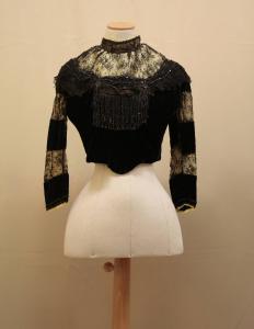 Corpino aderente, con stecche sul davanti, in velluto tagliato unito blu-nero. Collo a cinturino in tulle ricamato con filo dorato, sprone stondato in merletto nero, profilato da ruche in merletto nero e due giri di perline di jais nero; davanti al centro frangia di perline affiancata da due nappe con testa costituita da grande paillette. Davanti e dietro più pezzi inseriti per allargare il busto, desinente a punta oltre la vita, sia davanti che dietro. Apertura posteriore chiusa da ganci e nastro stringivita. maniche lunghe, a bande alternate in doppiato in organza gialla; al fondo due giri di perline. Fodera in taffetas color tabacco, con inserti, in corrispondenza delle allargature, in tela nocciola. All'interno, sul davanti, è applicato grossolanamente uno strato in tela di lana garzata.