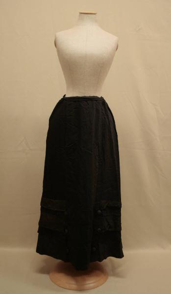 Gonna lunga leggermente svasata in tela nera. Confezionata in 3 teli: anteriore centrale diritto, profilato da piccole pieghe; teli laterali arricciati in vita e uniti al centro dietro. Cinturino nello stesso tessuto, rivoltato all'esterno; nastro grosgrain all'interno; apertura posteriore centrale chiusa da automatici. In basso, sotto il ginocchio, 5 balze arricciate ad altezze crescenti realizzate in diversi tessuti neri alternati. Nel pannello centrale, in corrispondenza delle balze, sono cucite tre losanghe in nastro nero che recano ciascuna 2 bottoni ricoperti in tessuto. La gonna potrebbe essere stata ritinta.