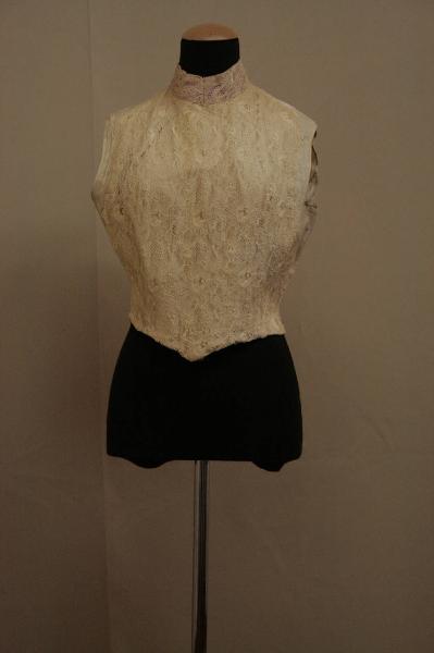 Camicetta aderente, con stecche, senza maniche. Confezionata in tela, simile ad un copribusto, con apertura posteriore totale chiusa da laccio passante in occhielli tondi. Collo a cinturino. Il davanti è coperto da merletto avorio doppiato in diagonale avorio. Il collo è in merletto doppio, con nastro in taffetas lilla inserito tra i due strati, che fuoriesce sul dietro e forma fiocco. La camicetta aveva una funzione di sottogiacca o pettorina.