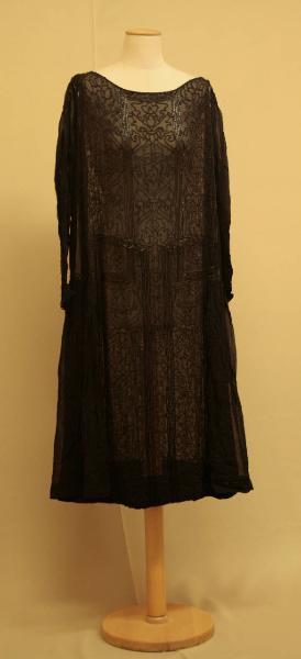 Abito a tunica, lungo al polpaccio, in crespo nero ricamato, eccetto le maniche, con perline di jais e cannette di vetro nere. Il ricamo raffigura un disegno tessile del XVI secolo con maglie e fiori di cardo, inquadrati da cornici lineari. \nScollo ovale,maniche strette chiuse al polso da 5 bottoni rivestiti. Sul davanti all'altezza dei fianchi, sono sovrapposti due pannelli non ricamati, arricciati, lunghi fino all'orlo e tenuti a piombo da un piccolo pesino. I pannelli e le maniche sono in crespo più leggero di quello dell'abito.