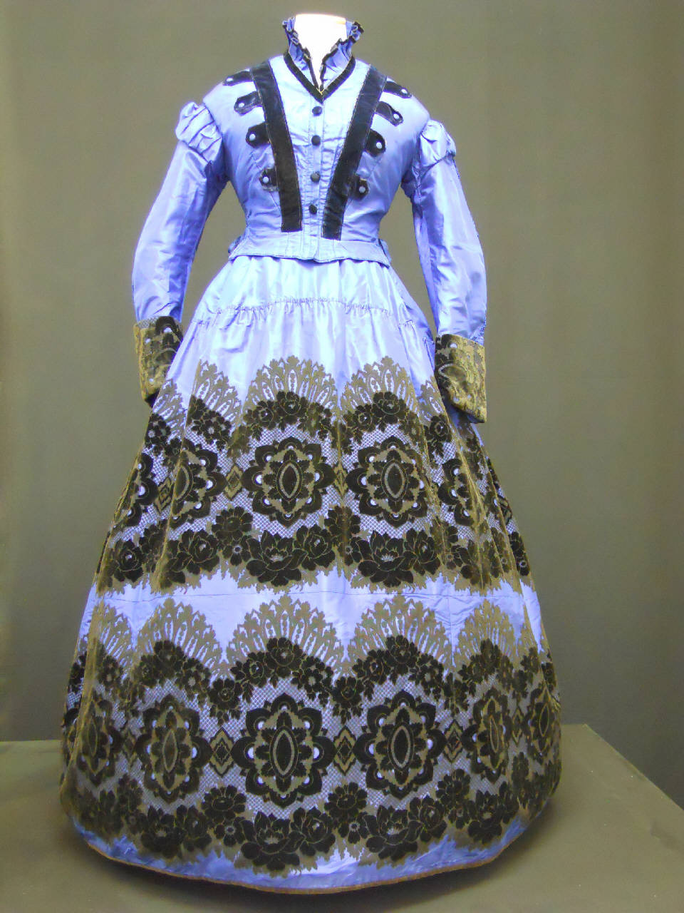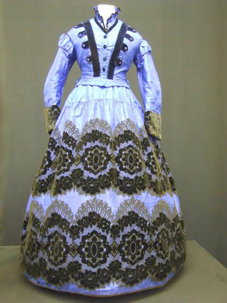 Completo con giacca in taffetas blu brillante con decorazioni in velluto nero e gonna in velluto cesellato nero a disposizione su fondo blu brillante. Giacca attillata, in origine con stecche, con modesta punta centrale. Breve scollo a V con gala pieghettata. Apertura anteriore con ganci e bottoni decorativi; i fianchi sono stati aperti e dotati di asole in metallo con laccio passante. Dietro in 3 pezzi. Applicazione in velluto che forma una V sul davanti, con linguette laterali con bottoni. Spalle calate, maniche lunghe sagomate, guarnite da inserti fittamente increspati. Alti paramani in velluto cesellato. Fodera in tela naturale, imbottitura in falda di lana.\nGonna a crinolina a 6 teli, baschina in taffetas e due alte balze arricciate in velluto cesellato con disegno a bande floreali orizzontali festonate. In vita sul davanti ampie pieghe che nascondono tasche a sacchetto inserite; sul dietro fitta pieghettatura e apertura centrale. Ai lati dell'apertura due lunghe cocche fissate al cinturino, in velluto cesellato, decorate all'orlo da grilletti in ciniglia nera. Fodera in rada tela; all'interno sono disposti lacci e bottoni per drappeggiare la gonna.\nGonna e giacca hanno subito modifiche: le stecche sono state rimosse; la baschina della gonna potrebbe essere stata alterata.