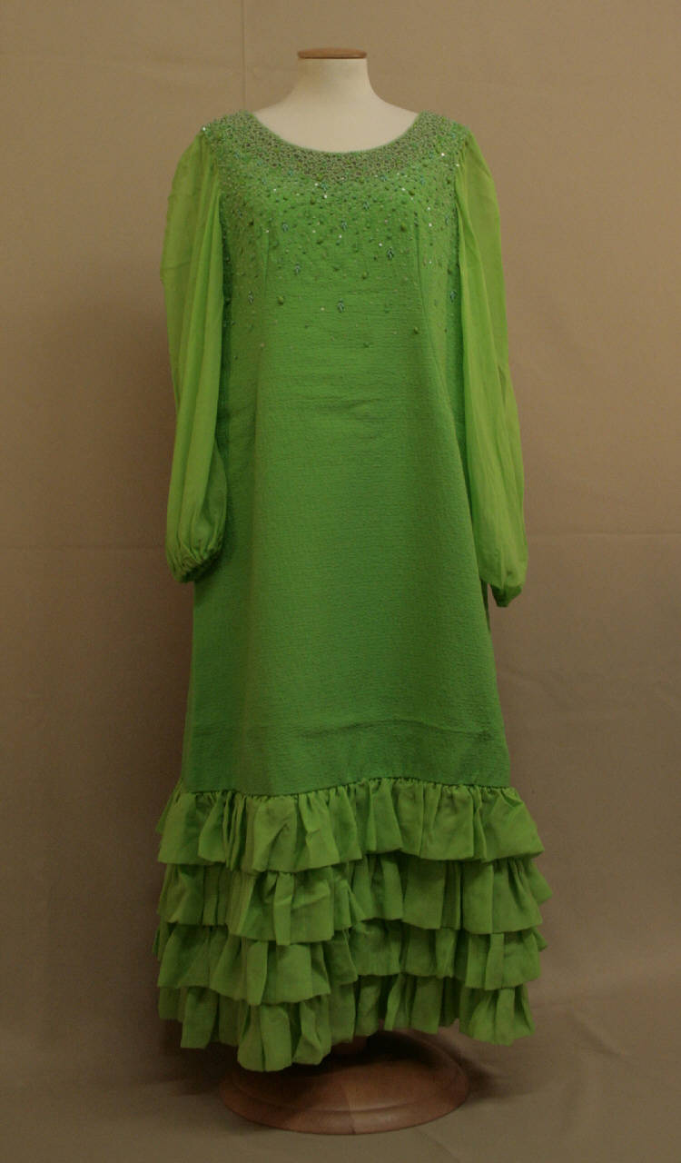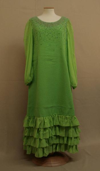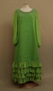 Abito lungo a tunica svasata, in tela goffrata verde mela, con maniche e balze in crespo dello stesso colore. Scollo rotondo, maniche lunghe, arricciate, blusanti, con elastico a coulisse al fondo. Apertura con cerniera al centro dietro. Attorno allo scollo ricamo ad applicazione di pailletes, perline e conterie in tonalità di verde che diradano scendendo verso il seno. Sotto il ginocchio sono applicate 4 balze arricciate. Fodera in taffetas sintetico verde mela.