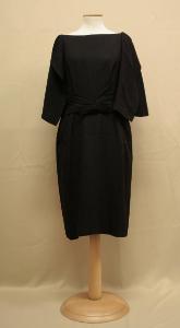 Abito corto senza maniche con finta mantellina sul davanti, in crespo nero. Scollo a barca sul davanti, a V sul dietro. Davanti con taglio in vita e pences aperte; tra il seno e la vita fascia con pieghe orizzontali, abbassata al centro da fiocco cucito. Dietro in 2 teli con pences chiuse, apertura sul fianco sinistro con cerniera. Alle spalle e lungo la parte posteriore dei giromaniche è fissata una mantellina chiusa sul davanti da bottoncino che copre le braccia fino al gomito. Fodera in taffetas nero. Etichetta in nastro operato con marchio all'interno presso la cerniera.