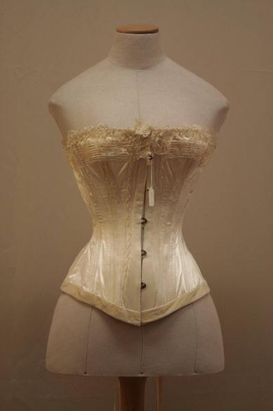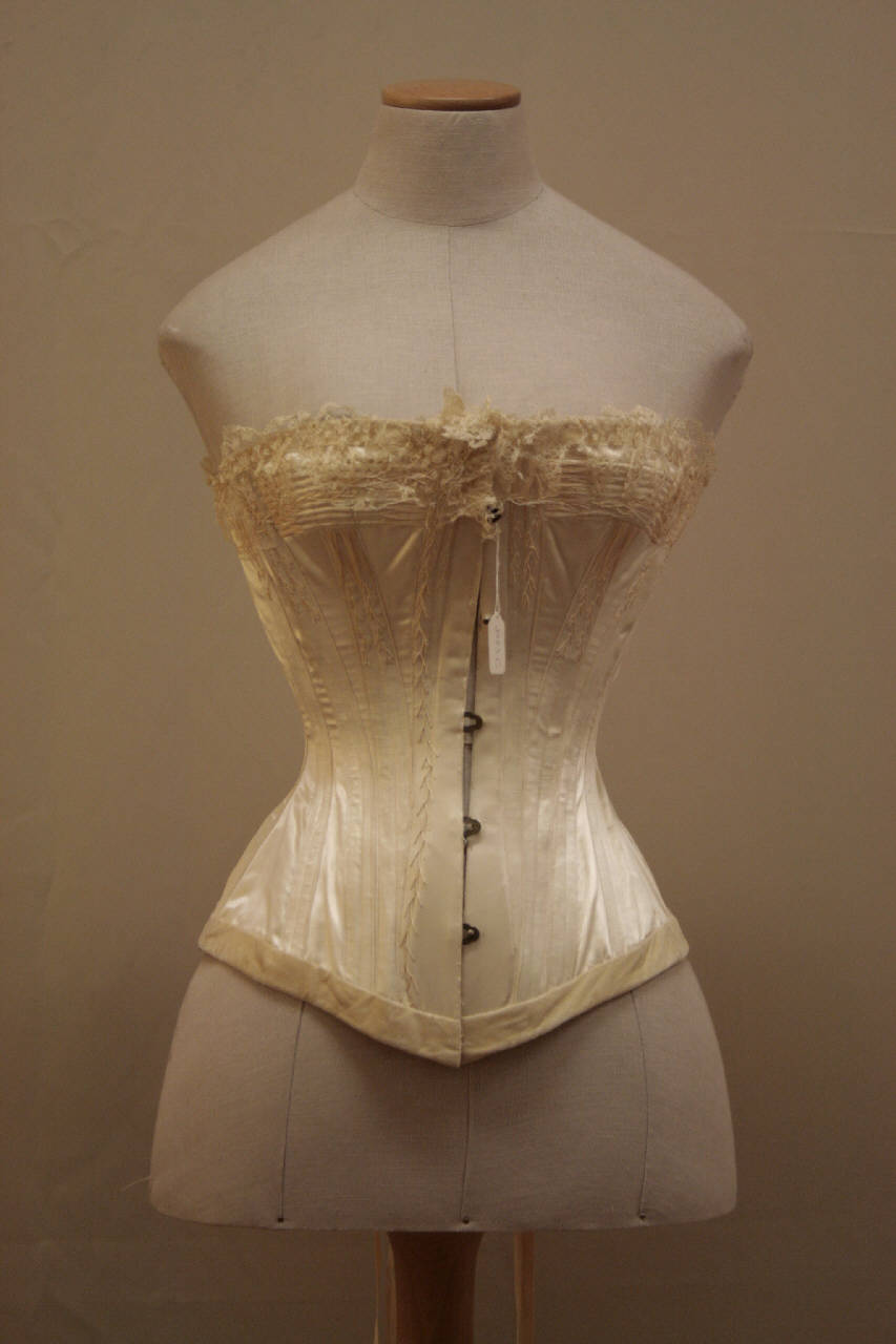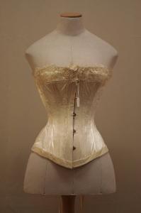 Busto steccato con 30 stecche non visibili, in raso avorio all'esterno e in diagonale bianca all'interno. Profili in velluto avorio. Chiuso sul davanti da 5 ganci e sul dietro da laccio passante in occhielli di metallo. Scollo totale leggermente più basso sul dietro: sul dvanti e sul dietro punta centrale che scende sotto i fianchi.