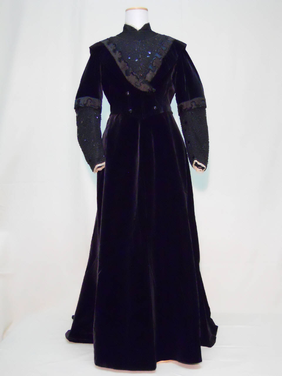 Completo, forse da lutto, formato da giacca e gonna in velluto nero ricamato, con inserti in tulle nero, ricamato con perline (jais) e paillettes.\nGiacca corta alla vita con punta stondata davanti e coda sul dietro, aderente con stecche. Girocollo, collo a cinturino profilato da ruche in crespo avorio e piccola pettorina in tulle nero a piegoline. Apertura anteriore con ganci, con sormonto a doppio petto al punto vita, segnato da due coppie di bottoni. Motivo a V, davanti e dietro, che parte dalle spalle e si chiude alla vita in tulle con perline jais e paillettes nere, profilato da aletta in velluto ricamato. Maniche arricciate, in velluto corte al gomito, profilate a ricamo; sottomaniche in tulle ricamato profilate al polso da ruche in crespo avorio. Fodera in taffetas nero, nastro stringivita.\nGonna a cupola asimmetrica a 5 teli, con breve strascico. Ampiezza modellata da una pence al centro davanti e raccolta da 4 pieghe al centro dietro, fermate a punto corallo.\nAlta banda in taffetas nero all'interno dell'orlo.