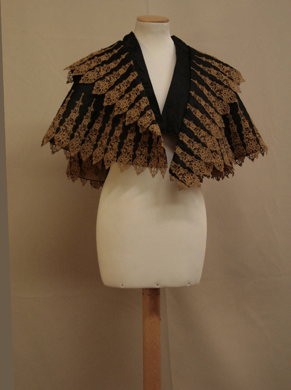 Mantellina corta al gomito, a ruota intera, in diagonale nera. Scollo e apertura anteriore, chiusa da un gancio, definiti da un'alta fascia rigida in taffetas nero. Ai lati dell'apertura ampio risvolto decorato, come l'orlo, da applicazioni di triangoli in merletto nocciola disposti a raggiera. Sul dietro, presso le spalle, 6 pieghe raccolgono all'ampiezza attorno allo scollo. Fodera di sostituzione in taffetas nero sintetico. Etichetta in nastro operato con marchio (poco leggibile). all'interno dello scollo.