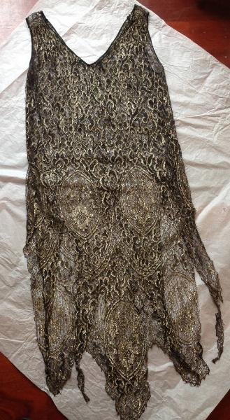 Abito corto al ginocchio di linea sciolta senza maniche in merletto nero e oro con orlo a smerli. Decoro floreale stilizzato, con teoria di medaglioni ovali includenti fiore disposti all'altezza dei fianchi e negli smerli dell'orlo.\nProfondo scollo a V davanti e dietro. Leggera arricciatura delle spalline nella parte anteriore. Bordo scollo e giromaniche profilati in sbieco di raso nero.