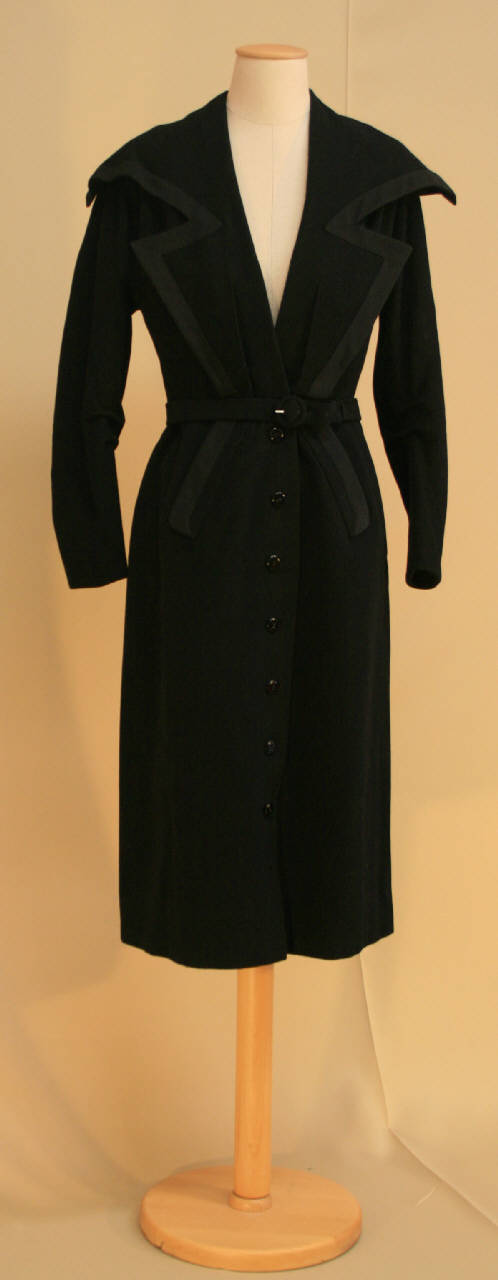 Abito robe manteau lungo al polpaccio, in panno nero con profili del collo in gros nero tagliato in sbieco. Tagliato in vita, con pinces sul dietro. Collo molto ampio con risvolti, I risvolti proseguono oltre la vita, divergendo e creando finte patte; apertura anteriore totale chiusa da 8 bottoni dalla vita all'orlo (uno mancante). Maniche lunghe a chimono, aderenti. Cintura nello stesso tessuto con fibbia tonda rivestita. Il collo è foderato in taffetas nero. Etichetta in nastro operato con marchio, all'interno nel fianco destro.