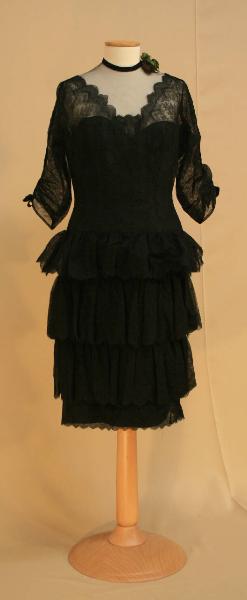 Abito lungo sotto il ginocchio, a vita bassa. La base dell'abito è in tulle nero, sul quale sono fissati merletti neri diversi. Sul corpino aderente sono disposti verticalmente dal davanti al dietro, creando ampio scollo a V, velato da pettorina in tulle con girocollo profilato in nastro di velluto nero, decorato a sinistra da mazzolino di fiori di seta. Apertura posteriore centrale con cerniera e tre bottoncini rivestiti. Maniche a 3/4, a chimono con tassello; arricciatura lungo la cucitura superiore, percorsa da nastro di velluto che forma fiocchetto al fondo. Gonna diritta, a 4 balze fittamente arricciate: le balze superiore e inferiore sono in diverso merletto. Fodera in taffetas nero a bustier, con 4 stecche. Etichetta in nastro operato con marchio, all'interno nel fianco sinistro.