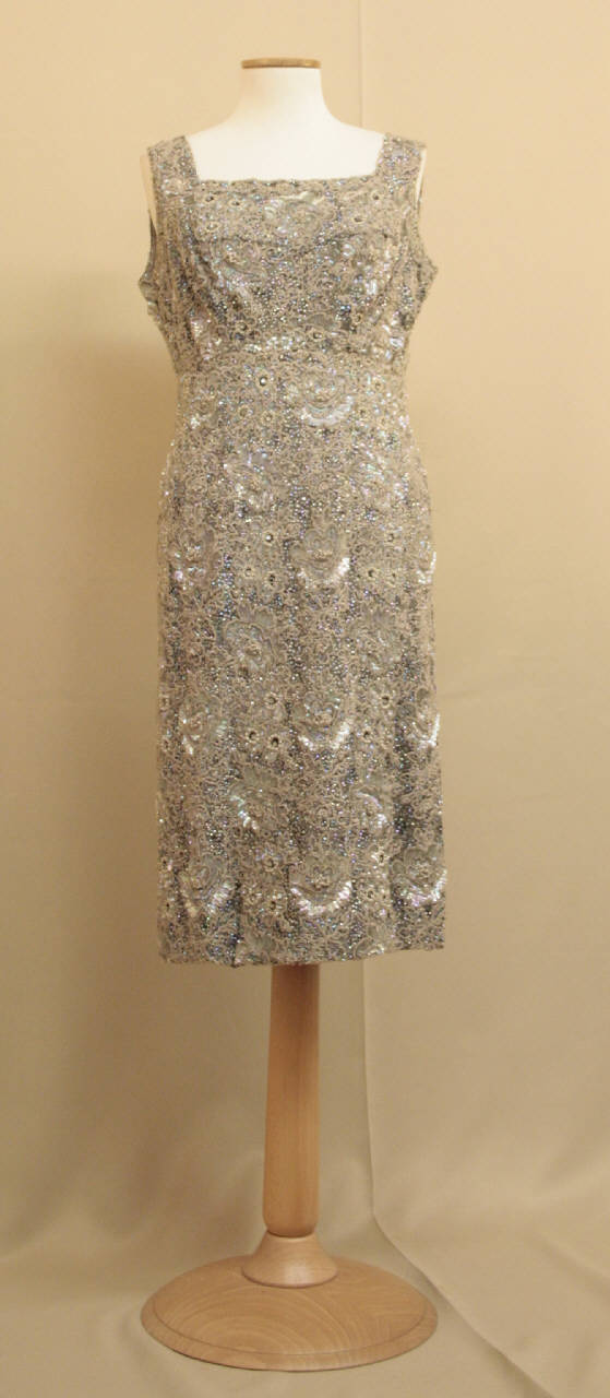 abito lungo sotto il ginocchio, senza maniche, di linea aderente. In doppio strato di tulle bianco e nero, ricoperto con applicazione di perline, paillettes, strass, perle finte in toni grigio-argento, e cordoncino bianco. Ampio scollo rettangolare; apertura al centro dietro con cerniera. \nL'abito è doppiato con crespo grigio chiaro nel corpino e con raso grigio argento nella gonna. Etichetta in nastro operato con marchio, all'interno sul fianco sinistro.