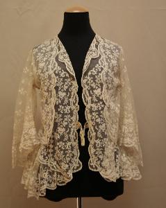 giacca in tulle a ricamo meccanico con applicazioni, ad imitazione merletto. Lunga ai fianchi, con alta gala arricciata all'orlo che forma punta al centro dietro. Scollo a V con piccoli risvolti, apertura anteriore chiusa al punto vita da due nastrini nello stesso tulle ricamato. Sul davanti finto bolero sovrammesso dello stesso tessuto. Maniche al gomito, svasate e con alta gala arricciata al fondo.