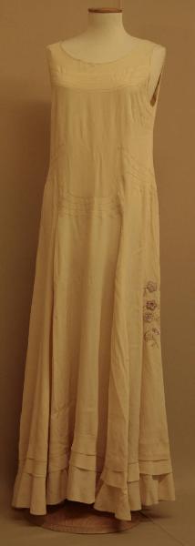 abito lungo appena svasato al fondo, senza maniche, in crespo avorio. L'abito è tagliato in sbieco, con tagli decorativi chiusi da nervature, intorno allo scollo e sui fianchi. Ampio scollo rotondo. All'orlo 3 corte balze in sbieco. Sul fianco sinistro è applicato un decoro a fiori all'uncinetto, in cotone avorio e toni di rosa, incongrui con la fattura dell'abito, per nascondere un danno riparato con toppa sottomessa. All'interno delle nervature che chiudono i tagli doppiatura in louisine avorio per sostenere il tessuto.