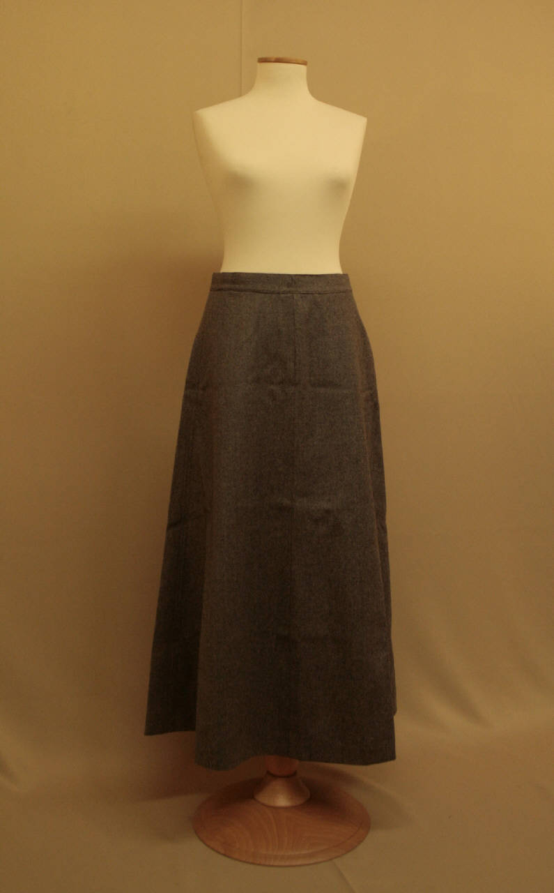 maxigonna in diagonale grigio scuro, in 4 teli sbiechi, con cuciture impunturate sui fianchi. Cinturino, apertura con cerniera al centro dietro. Fodera in taffetas grigio scuro.