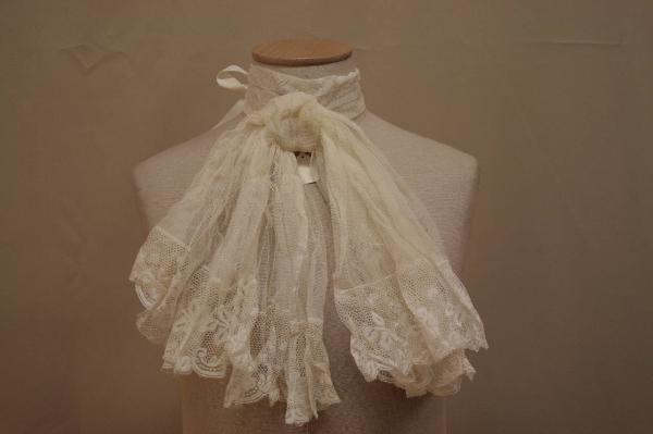 13 colli jabot in tulle bianco. Collo a cinturino, fermato dietro da fettucce bianche. Al centro davanti un passante in tulle ferma un'ampia banda arricciata in tulle che ricade in due cocche profilate da alto merletto bianco.