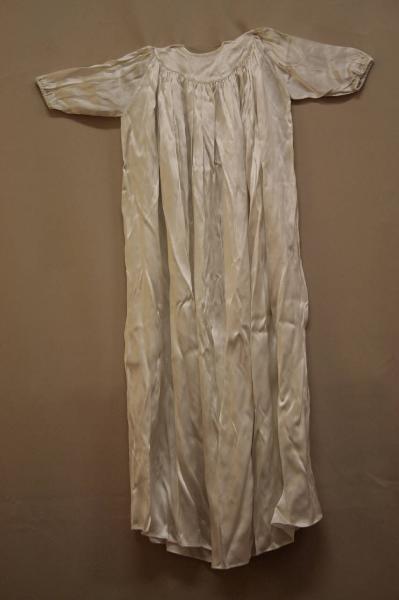 Abito, o sottabito, molto lungo in raso avorio, apertura totale chiusa da in alto da 2 bottoncini in madreperla bianchi. Sprone semicircolare, davanti e dietro, a cui è fissata la parte inferiore fittamente arricciata. Maniche lunghe strette al polso da coulisse con elastico.