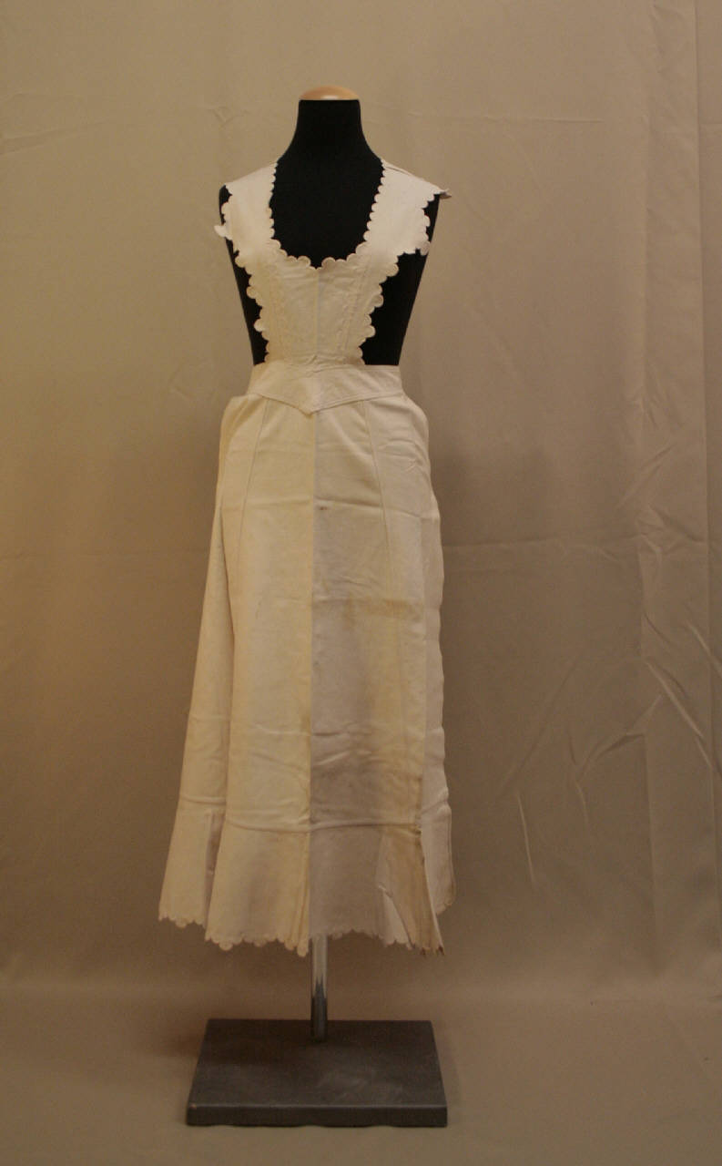Grembiule lungo con pettorina e bretelle, da legare in vita, in diagonale bianco profilato da smerli a punto festone. La gonna è in 3 teli sbiechi. All'orlo balza svasata.