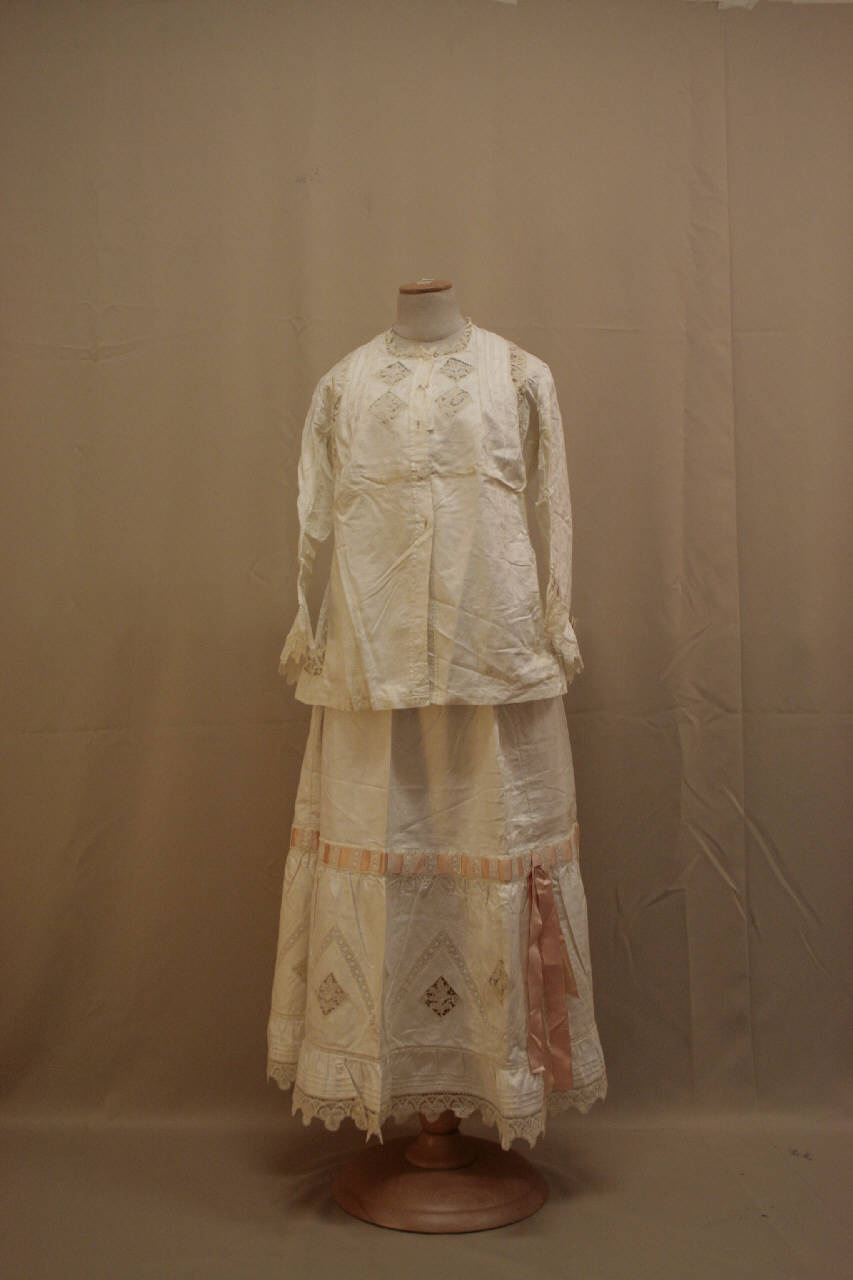 Completo composto da copribusto (a), mutande (b), sottogonna (c) e matinée (d), in damasco bianco liseré con motivo di piccoli fiori a scacchiera. decorati con tramezzi passanastro in tela bianca a ricamo meccanico e nastro in taffetas rosa chiaro, merletti a punto rinascimento con motivo a trifogli e inserti romboidali in merletto a punto rinascimento con iris o fiori a calice. Il completo è piegato, con carta gialla.