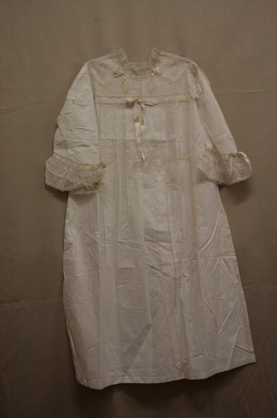 Completo composto da copribusto (a), mutande (b), camicia da giorno (c), camicia da notte (d) e sottogonna (e). Copribusto e camicia da giorno in batista bianca; mutande, camicia da notte e sottogonna in tela bianca. Decorati in bianco con tramezzi passanastro in tela ricamata (ricamo meccanico) con girasoli e nastro in raso avorio; inserti romboidali grandi e piccoli ricamati ad effetto sfilato (meccanico), tramezzi e ruches in merletto meccanico.