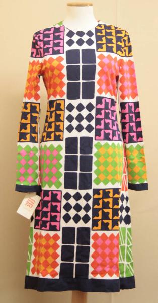 Abito lungo sotto il ginocchio, in jersey stampato a decori geometrici policromi in campi quadrati con fondo alternativamente bianco e nero. Linea morbida, appena svasata; girocollo, apertura posteriore con cerniera; maniche lunghe aderenti. Maniche e orlo profilati con bordo rimesso in jersey nero. All'abito è afficco cartellino a goccia in cartoncino con marchio.
