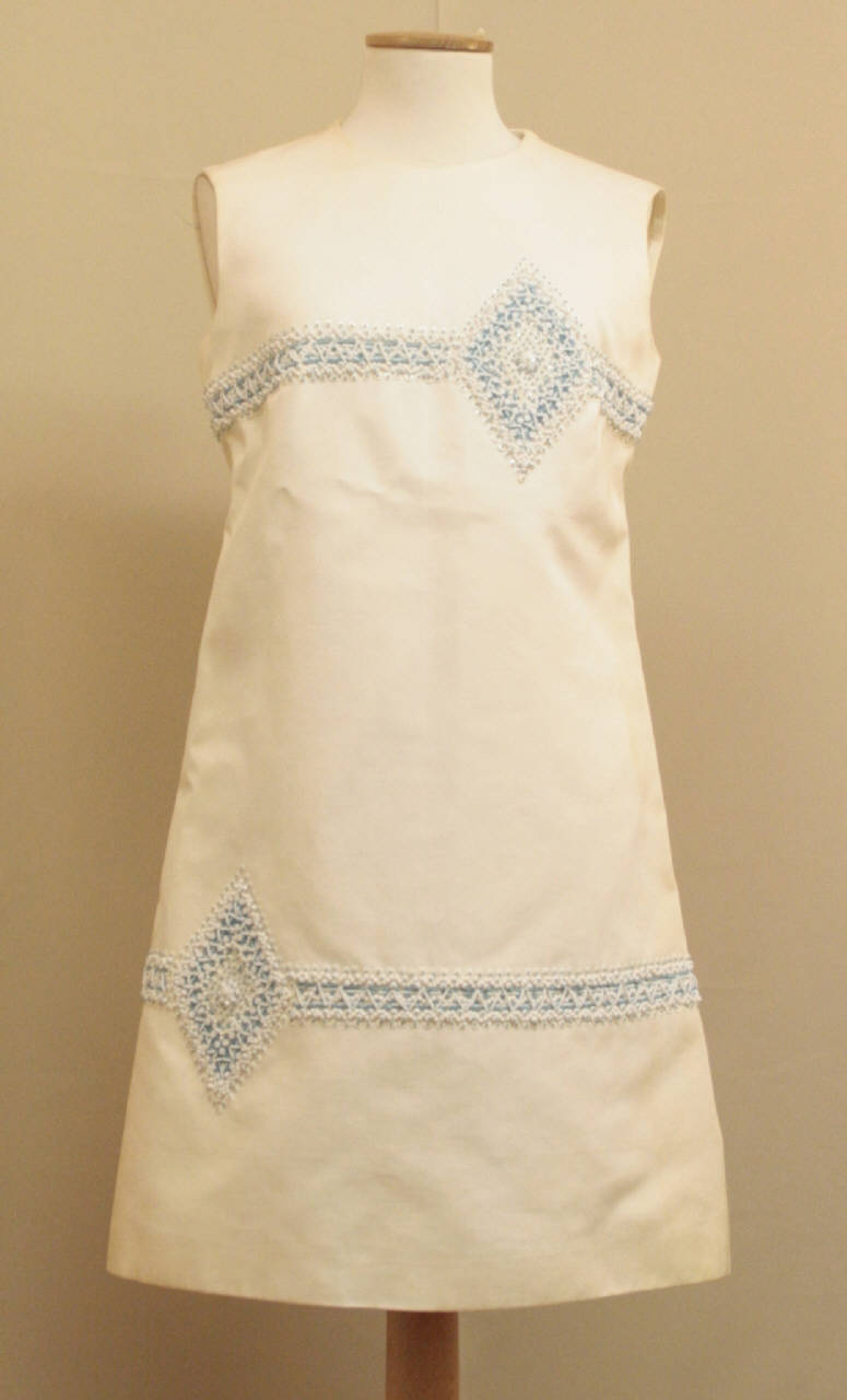 Abito lungo sotto il ginocchio, senza maniche, in diagonale bianco doppiato con organza bianca, ricamato con perline, paillettes e conterie bianche e azzurre che formano una cornice trasversale sul seno con losanga a sinistra. Lo stesso motivo è riproposto presso l'orlo, con losanga a destra. Di linea appena svasata, girocollo. Apertura con cerniera al centro dietro.