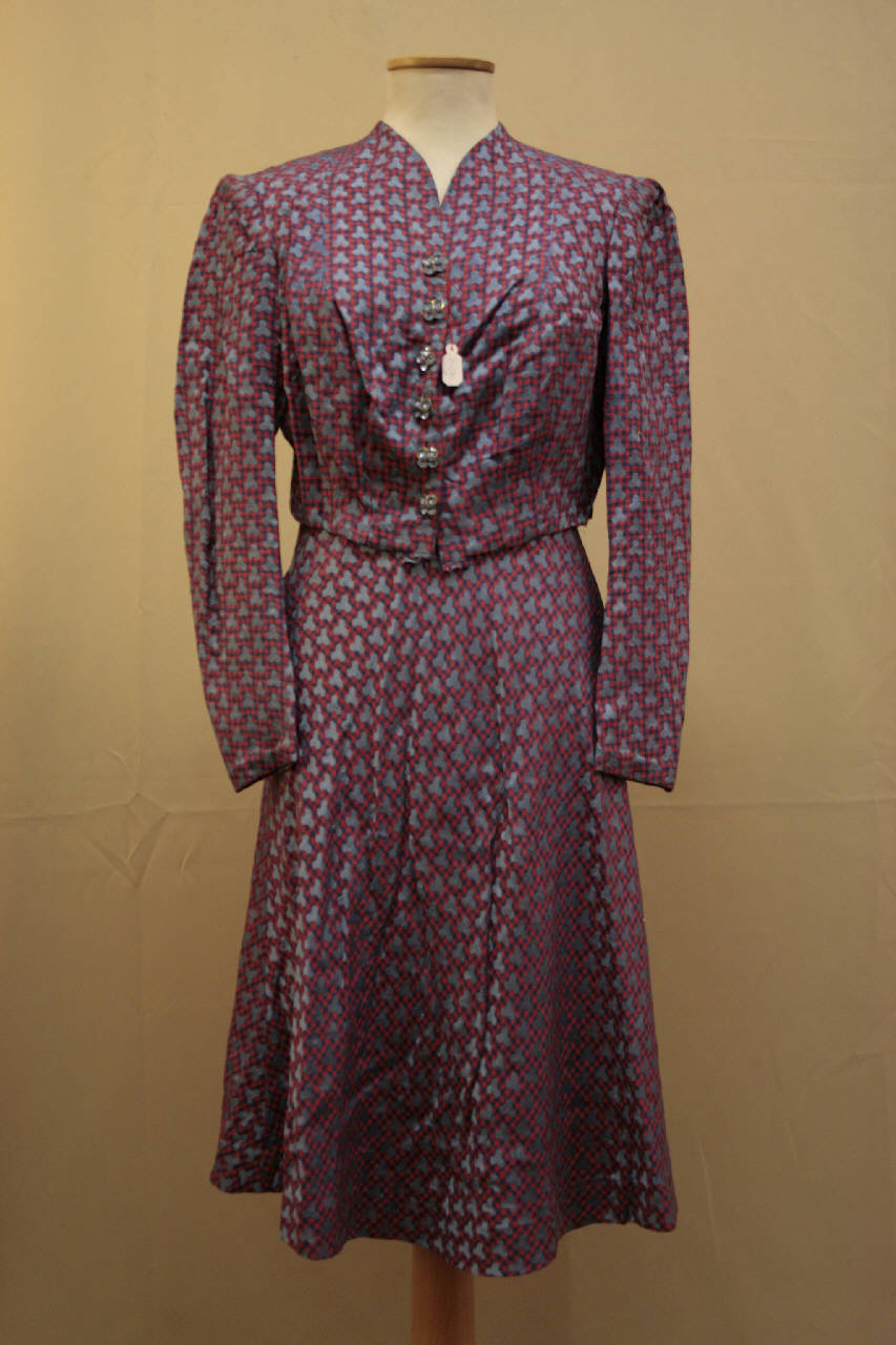 completo formato da giacca corta in vita e gonna lunga al polpaccio, confezionati in tessuto doppio (taffetas quadrettato rosso e blu, a scambio con taffetas celeste): nella confezione è stata privilegiata la faccia con decoro a motivi trifogliati geometrici celesti su fondo quadrettato rosso/blu. Giacca sagomata da pinces, scollo a V leggermente montante, apertura chiusa da 6 bottoni gioiello di strass a quadrifoglio. Maniche lunghe, sostenute da spallini imbottiti. Fodera in crespo celeste. Gonna svasata, a due teli sbiechi. Senza cinturino, apertura con cerniera sul fianco sinistro. Etichetta in nastro operato con marchio, all'interno di giacca e gonna, sul fianco destro.