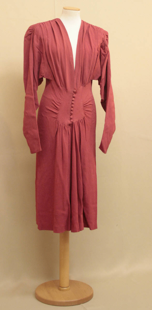 Abito lungo al polpaccio, di linea svasata, in crespo color lampone. Scollo profondo a V, con apertura centrale che scende oltre la vita. Maniche lunghe a chimono con arricciatura lungo la cucitura superiore. Il corpino è arricciato al punto vita, dove è inserita una baschina a T che nel prolungamento centrale ospita la fitta abbottonatura con 10 bottoncini rivestiti e asole in tessuto. Gonna svasata, in 4 teli, increspata attorno al prolungamento della baschina.