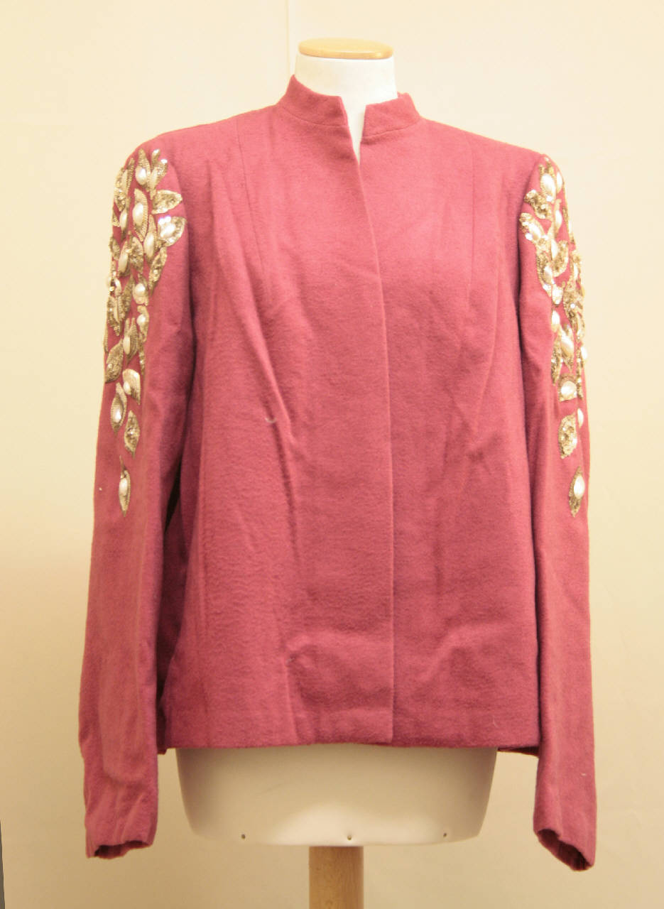 Giacca di linea diritta, lunga ai fianchi, in panno color lampone; decorata su maniche e dorso con applicazione di ovali bombati cavi in madreperla, circondati da paillettes argentate. Collo a cinturino, mostre accostate senza sistemi di chiusura, Maniche ampie. Fodera in taffetas color lampone.
