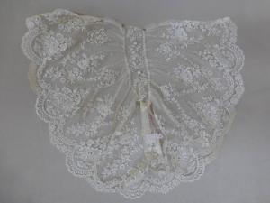 Ampio jabot in merletto di tulle ricamato avorio con bordo smerlato. Sottile striscia verticale in diverso merletto, decorata con 3 bottoni goiello di strass, alla quale è fissata su tre lati una balza arricciata.
