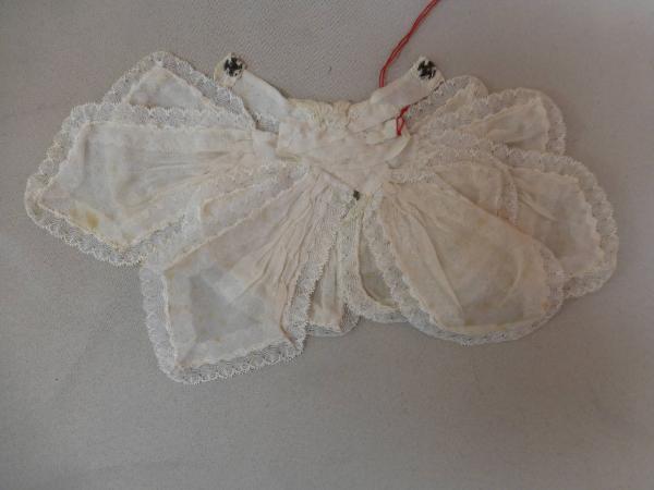 Confezionato in crespo avorio: serie di petali a punta e stondati, arricciati e profilati da merletto avorio smerlato. I petali sono sovrapposti a ventaglio a più strati, fissati ad un cinturino con automatici alle estremità per fissarlo ad un collo. Lo jabot è stato accorciato ripiegando e cucendo irregolarmente il cinturino.