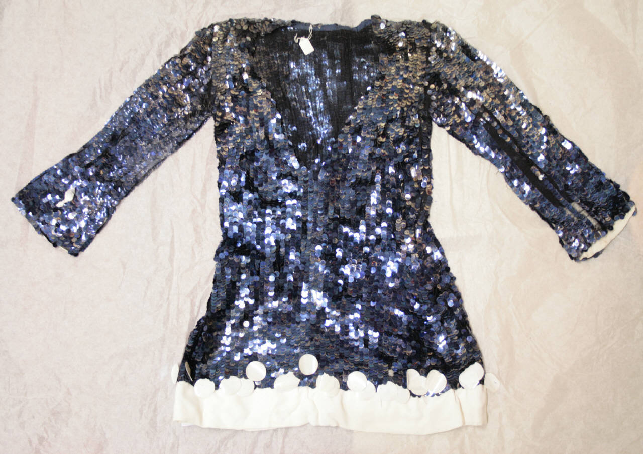 blusa in tulle nero completamente ricoperto di paillettes blu. Di linea aderente sagomata ai fianchi, profondo scollo a V, maniche lunghe appena svasate al fondo. Lunga fin sotto i fianchi, profilata all'orlo da fascia un diagonale bianco con grandi paillettes bianche.