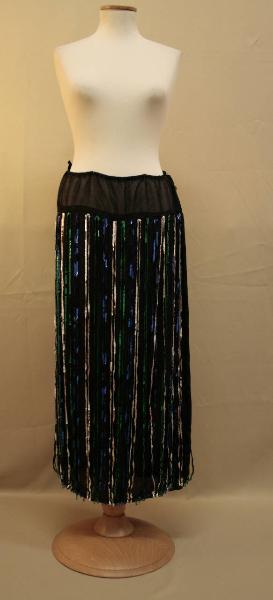 gonna lunga diritta, in crespo nero in doppio strato. Baschina in tela nera, stretta in vita da coulisse con elastico. Decorata con fili di paillettes, fissati sotto la baschina e che scendono sciolti fino all'orlo, nei colori argento, verde, blu, fermati all'orlo da un pendente a goccia nello stesso colore. Confezione non accurata, probabilmente domestica.