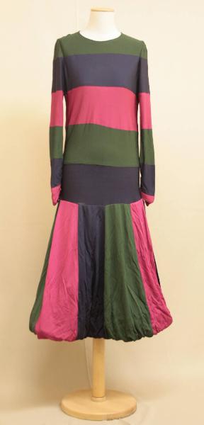 abito lungo al polpaccio, a vita bassa con gonna a palloncino. Confezionato in jersey a bande verde, blu e fucsia cucite tra loro. Corpino a vita bassa a bande orizzontali, girocollo con breve apertura posteriore centrale chiusa da automatici; maniche lunghe, aderenti, a bande orizzontali. Gonna a bande verticali, a palloncino reso da sottogonna in taffetas nero, più corta, sulla quale è rimborsato l'orlo della gonna.