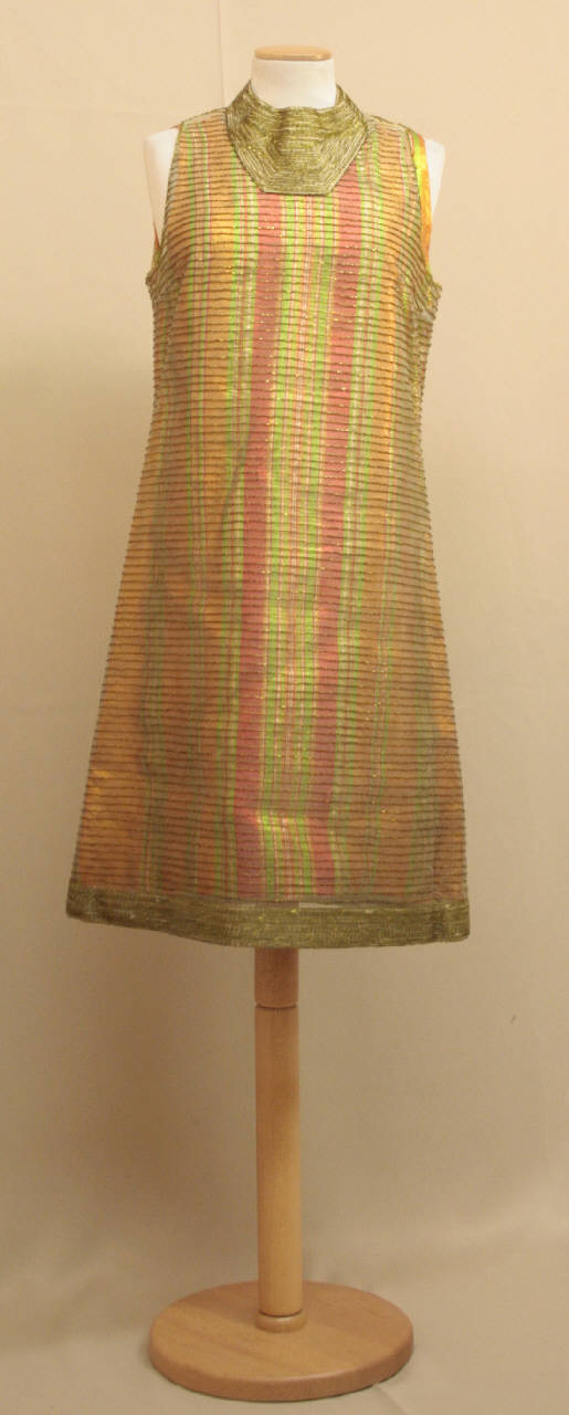 Abito corto sopra il ginocchio, senza maniche, di linea a trapezio. Formato da due strati, originariamente cuciti insieme, ora separati. Strato esterno in tulle doppio, avorio, ricamato con cannette dorate disposte a fitte barrature. Girocollo con collo sagomato fantasia.Lo strato interno è in tessuto laminato (diagonale barrata, ordito in filo dorato trama variante di colore argento, arancio, verde, rosso) tagliato con ordito in orizzontale così da avere righe verticali. Apertura con cerniera al centro dietro.
