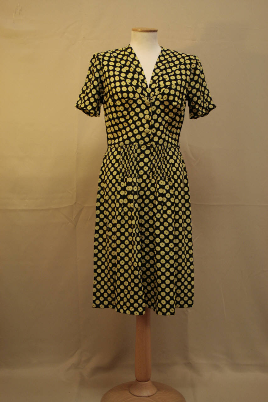 Abito chemisier, lungo appena sotto il ginocchio, in crespo stampato nero a piccole corolle giallo limona. Scollo a V con pieghe a ventaglio alla base dello scollo; apertura fino alla vita con 3 bottoni rivestiti. Maniche corte, arricciate, con spallini. Apertura con cerniera sul fianco sinistro. Gonna svasata, sul davanti in 3 teli, quello centrale con due gruppi di fitte arricciature da sotto la vita ai fianchi che creano pieghe irregolari. Dietro in un telo con pinces. Orlo tenuto a piombo da piccoli pesi.