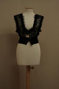 Corpino privo delle maniche e della pettorina. In merletto nero a punto rinascimento, con alta fascia in vita in velluto nero con pieghe orizzontali, con stecche, e bordi in velluto nero. Attualmente ha scollo a V profondissimo, definito da due lunghe bande che coprono le spalle, raccordate in basso dalla fascia in vita, recanti lungo i bordi residui di tulle nero; apertura totale posteriore chiusa da ganci. Alla base dello scollo, davanti e dietro, sono due inserti quadrati di merletto meccanico raffiguranti tulipano. I residui di tulle nero suggeriscono la presenza, in origine, di pettorina e maniche.