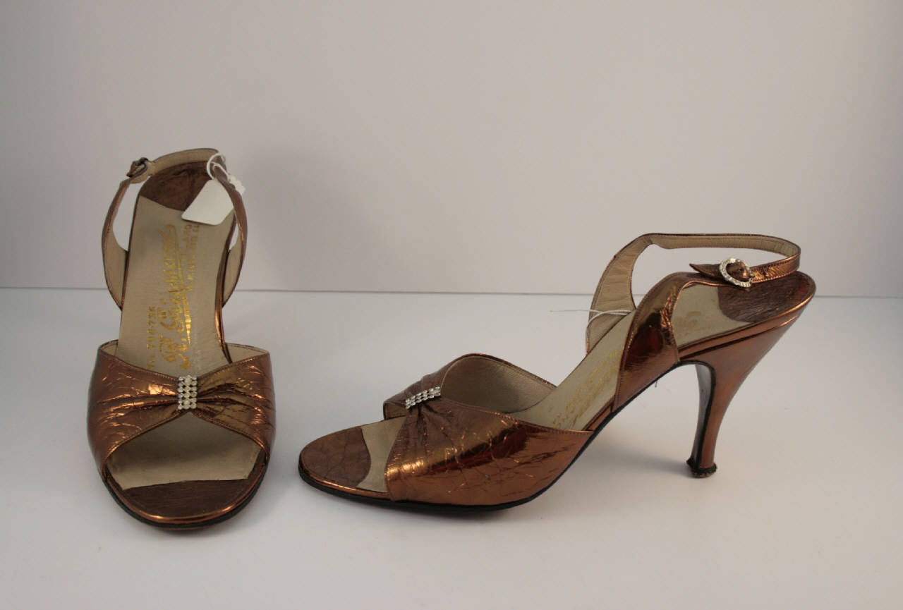 sandali in pelle dorata color rame, tomaia a fascia sull'avampiede arricciata al centro e fermata da strass; cinturino attorno al tallone, con fibbia decorata da strass. Tacco alto a spillo, ricoperto nella stessa pelle della tomaia.\nFodera e suoletta in pelle bianca.\nSuola in cuoio nero che si prolunga a ricoprire la gola del tacco.