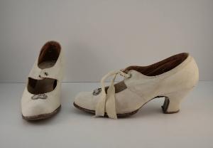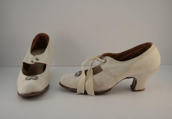 scarpe modello Carlo IX, con tomaia in 3 pezzi in pelle scamosciata bianca. Gambini prolungati sul davanti che formano cinturini sul collo del piede, dove sono allacciati da nastro di raso bianco (uno perduto) passante in occhielli metallici. Punta rotonda, scollatura decorata da applicazione centrale cucita in metallo con strass. Tacco medio in legno, a coda ricoperto nella stessa pelle scamosciata. Fodera in tela nocciola nei gambini e in diagonale nocciola nella parte anteriore; sottopiede in feltro avorio. Suola in cuoio grigio che si prolunga a ricoprire la gola del tacco; rinforzo in cuoio sulla suola.