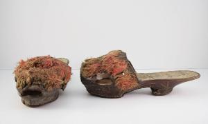 pianelle a zeppa con mascherina a fascia in cuoio inciso, decorato a fiori stilizzati tipo papiro. La fascia è aperta in punta e ai lati, ricoperta da fitte nappe a cavaliere in seta arancio. Pianella destra e sinistra indifferenziate. Zeppa in legno che forma tacco a coda, ricoperta in cuoio come la tomaia. Fodera e suoletta in pelle bianca. Suola in cuoio che si prolunga a ricoprire l'accennata gola del tacco.