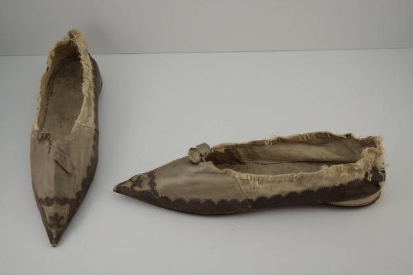scarpe modello décolleté con tacco piatto (tipo ballerina), con tomaia in 3 pezzi in raso avorio. Bordo verso la suola in nappa marrone con margine smerlato profilato a piccolo sopraggitto; la stessa nappa forma decoro sulla punta. Lungo la scollatura coulisse formata dallo stesso tessuto; piccolo fiocco sul davanti al centro della scollatura. Scarpa destra e sinistra indifferenziate. Lunga punta molto sfilata; tacco piatto in legno (?) rivestito di pelle bianca, inserito tra il sottopiede e la suola. Fodera e suoletta in pelle bianca, nella punta fodera in tela. Suola in cuoio.
