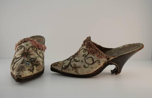 Pianelle con mascherina in pelle bianca ricamata in seta policroma a punto raso e pieno, oro filato e riccio a punto posato; motivo a girali dorati, fiori policromi e foglie verdi; piccole toppe in pelle ricamata, analoga o simile alla principale. Mascherina sagomata a punta sul collo del piede e profilata da doppia ruches in nastro rosa in diversi tipi di taffetas. Pianella destra e sinistra indifferenziate. Lunga punta molto sfilata e leggermente rialzata; tacco alto a coda, in legno ricoperto di pelle marrone scuro. Fodera in pelle scamosciata marrone, suoletta in pelle bianca. Suola in cuoio che si prolunga a ricoprire la gola del tacco; rinforzo in cuoio aggiunto nella parte anteriore della suola; in una delle pianelle è fermato al tacco con graffette metalliche.\nSu una suoletta è scritto a mano "634".