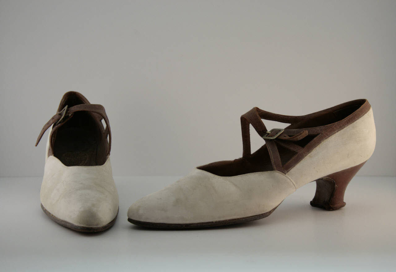 scarpe modello Carlo IX, con tomaia in 3 pezzi in pelle scamosciata bianca, profilata nei gambini in pelle marrone. Chiuse sul collo del piede da cinturino marrone che forma motivo a tre raggi all'attaccatura, fermato da fibbia. Punta sfilata, tacco medio a coda e a rocchetto, in legno ricoperto di pelle marrone. Fodera e suoletta in pelle marrone. Suola in cuoio che si prolinga a ricoprire la gola del tacco.\nTimbro dorato nella suoletta riportante "Hook, Kowles & C.o L.d Makers to the Royal Family, 66 e 65 New - London"