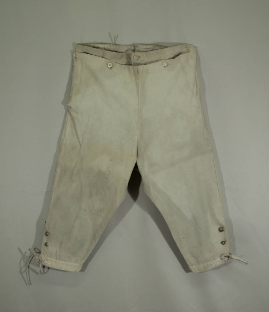 confezionati in panno avorio. \nCintura chiusa davanti con 2 bottoni in osso. Bottoni per bretelle sul dietro, perduti sul davanti.\nLarga patta alla marinara fermata a 4 bottoni. Tasche sagomate inserite sui fianchi, chiuse da bottone. Gambe aderenti, con spacco al fondo chiuso da 2 bottoni in metallo e da cinturino chiuso con fettuccie da annodare. \nFodera nella cintura e nello spacco in tela bianca.