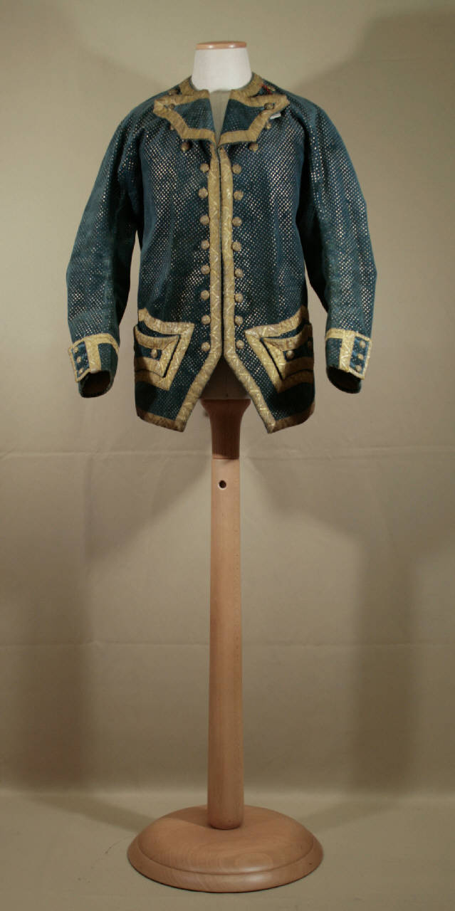 composta da giacca e calzoni in velluto tagliato unito azzurro scuro (tinto in pezza) decoro a minuti pois dorati dipinti; profilati da gallone dorato con gigli stilizzati. \nGiacca lunga ai fianchi, breve scollo a V con risvolti sagomati. Mostre diritte, chiuse da ganci in metallo (di sostituzione, presenti solo 3 coppie), decorate da intrambi i lati da fila di 12 bottoni ricoperti ad ago con filo dorato. Corte falde diritte, a punta sui fianchi. Dorso in due pezzi, aderente, con corto spacco al centro dietro e sui fianchi. Maniche lunghe, aderenti, sagomate; a decorata da 3 bottoni. l fondo risvolto e spacco chiuso da 3 bottoni. Tasche con finta patta definita da gallone. Fodera nei quarti anteriori in diagonale celeste, dorso e maniche in tela di lana. \nCalzoni con alta cintura chiusa davanti con 4 bottoni ricoperti; la cucitura posteriore è aperta quasi totalmente. \nPatta verticale fermata da 1 bottone. Due taschini con patta cucita nella cintura, due tasche sagomate laterali, chiuse da bottone. Gambe aderenti, con spacco al fondo chiuso da 6 bottoni dorati ricoperti ad ago; cinturino ricoperto da gallone, con bottone. \nFodera in tela bianca.