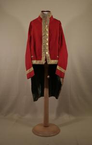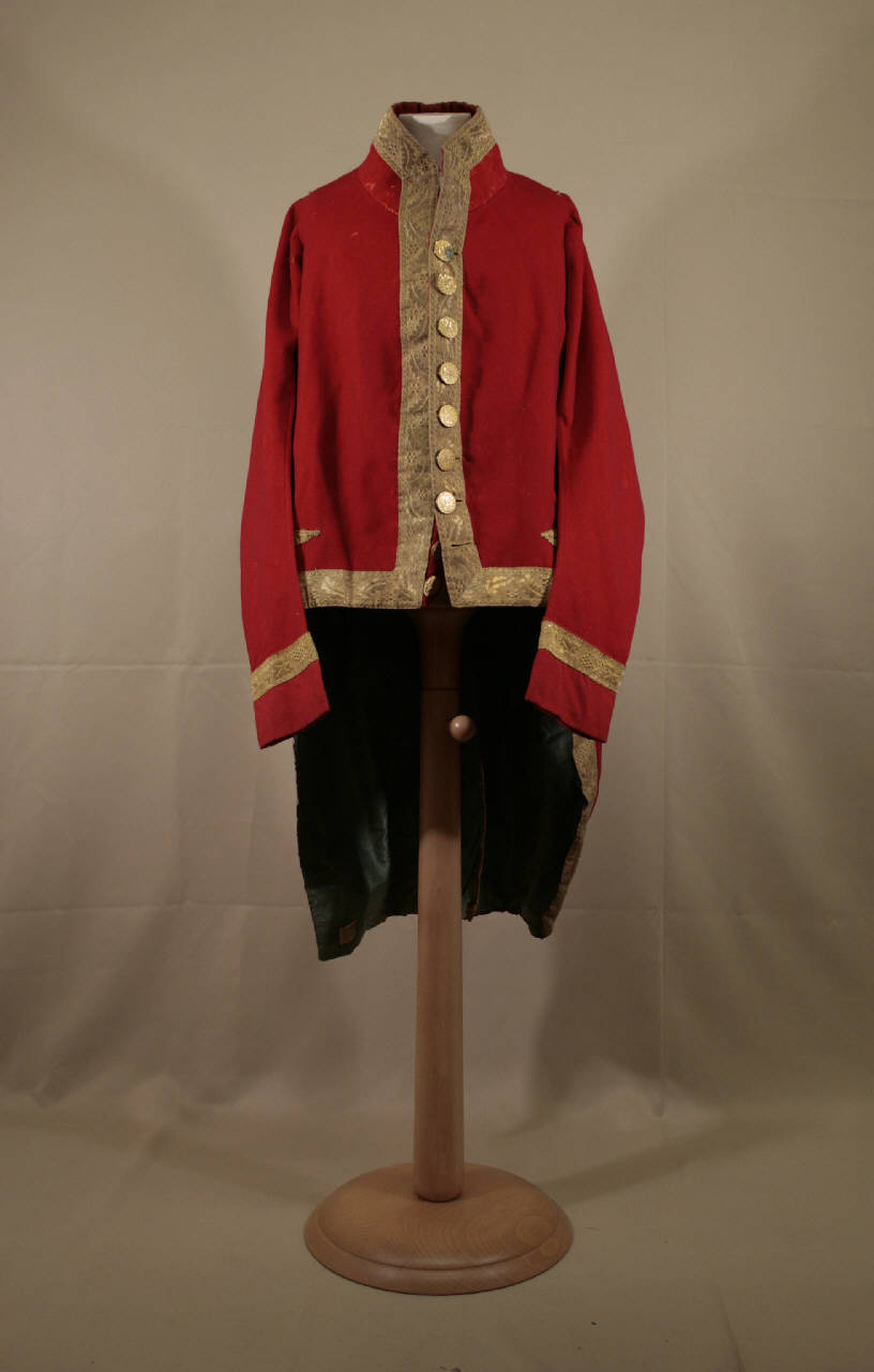 Marsina di livrea in panno rosso decorata da alto gallone dorato con motivo a foglie e fiorellini stilizzati.\nCollo alto a cinturino, mostre appena stondate e con taglio diritto in vita, con 9 bottoni in metallo dorato con decoro floreale e 8 occhielli corrispondenti (non realizzato l'occhiello più in basso).\nFalde molto sfuggenti verso il dietro. Tasche sui fianchi, arretrate con patta sagomata inclusa in finta patta definita dal gallone.\nManiche molto lunghe, sagomate, con paramani. Sulle spalle asole ad ago per inserimento di spalline.\nDorso stretto che scende fino al punto vita; spacchi laterali cuciti entro piega, decorati da bottoni in alto; spacco centrale.\nFodera in taffetas verde; in tela di lana rossa nel collo..