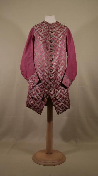 Sottomarsina lunga oltre i fianchi in raso rosso lampone, broccato in argento filato, oro filato e seta. Motivo a maglie romboidali di foglie dorate con boccio di garofano argento ai vertici; all'interno mazzolino di garofani policromi con orientamento alterno. Girocollo, mostre diritte chiuse da 14 bottoni ricoperti ad ago in argento filato; occhielli corrispondenti rifiniti in oro. Nella parte bassa della mostra sinistra tracce di 5 occhielli decorativi scuciti. Ampie falde a punta, successivamente cucite alle falde posteriori, grandi tasche e patte sagomate con 3 occhielli decorativi (tracce di altri 2 scuciti) e 3 bottoni sotto la patta. Dorso in louisine rosso lampone con inserti sui fianchi e sulle spalle. Maniche in più pezzi in louisine, lunghe, aderenti e sagomate, con polso nel raso broccato, con spacco chiuso da 2 bottoni. Fodera in tela naturale.