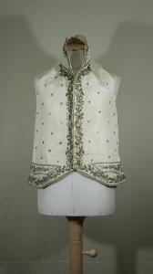 Gilè corto in vita in louisine avorio, ricamato con oro filato, paillettes e canutiglia dorate a puntop posato con motivo di tralci ondulanti con foglie stilizzate (quercia e ulivo?); sparsi fiorellini stilizzati. Alto collo a cinturino (7,5 cm), mostre diritte chiuse da 9 bottoni rivestiti e 6 occhielli corrispondenti dal petto alla vita; i 3 bottoni in alto corrispondono a 3 occhielli decorativi ricamati a disposizione.\nCorte falde molto divergenti a punta, con patte decorative sagomate. Dorso in tela naturale, regolabile con coppia di lacci.\nFodera dei quarti anteriori in tela di lino, mostre, collo e falde in diagonale avorio.