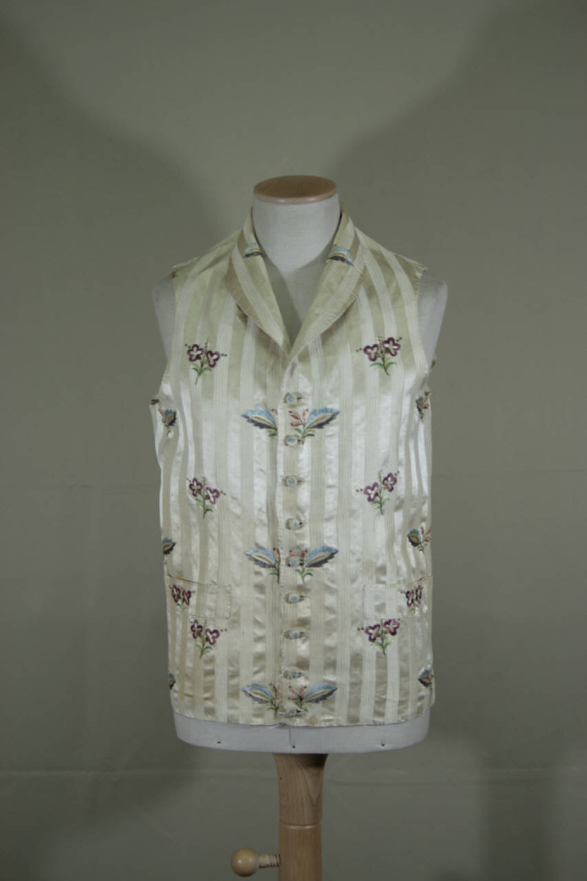 Gilè lungo appena oltre la vita, in pekin (raso-taffetas) liseré, avorio rigato opaco e lucido, ricamato a disposizione con seta policroma a punto erba, pieno, lanciato con motivo a scacchiera di fiori tipo violette e boccioli con grande foglia celeste. Breve scollo a V, collo sciallato, mostre diritte chiuse da 9 bottoni rivestiti e occhielli corrispondenti dallo scollo al fondo; diritto al fondo, con tasche con patta cucita. Dorso in tela bianca, regolabile con coppia di lacci.\nFodera dei quarti anteriori in tela.