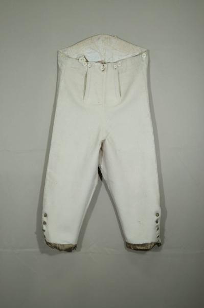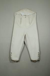 calzoni ricavati tagliando all'altezza del ginocchio pantaloni aderenti, confezionati in panno avorio. Il taglio è coperto da gallone dorato che funge da cinturino.\nAlti in vita, chiusi davanti con 4 bottoni in osso e stretta patta alla marinara fermata a 3 bottoni. Dietro coppia di cinturini senza sistema di chiusura. Bottoni per bretelle davanti e dietro.\nPrivi di tasche. Gambe molto aderenti, con spacco al fondo chiuso da 4 bottoni dorati ricoperti ad ago.\nFodera in tela bianca all'interno del punto vita e nello spacco.