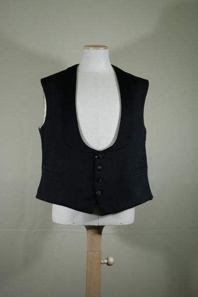 gilè di livrea monopetto in panno nero, corto alla vita, scollo a ovale con collo sciallato, apertura con 4 bottoni e occhielli corrispondenti. Dorso in raso nero regolabile con coppia di cinturini con fibbia, fodera in raso rigato. Etichetta in nastro stampato.